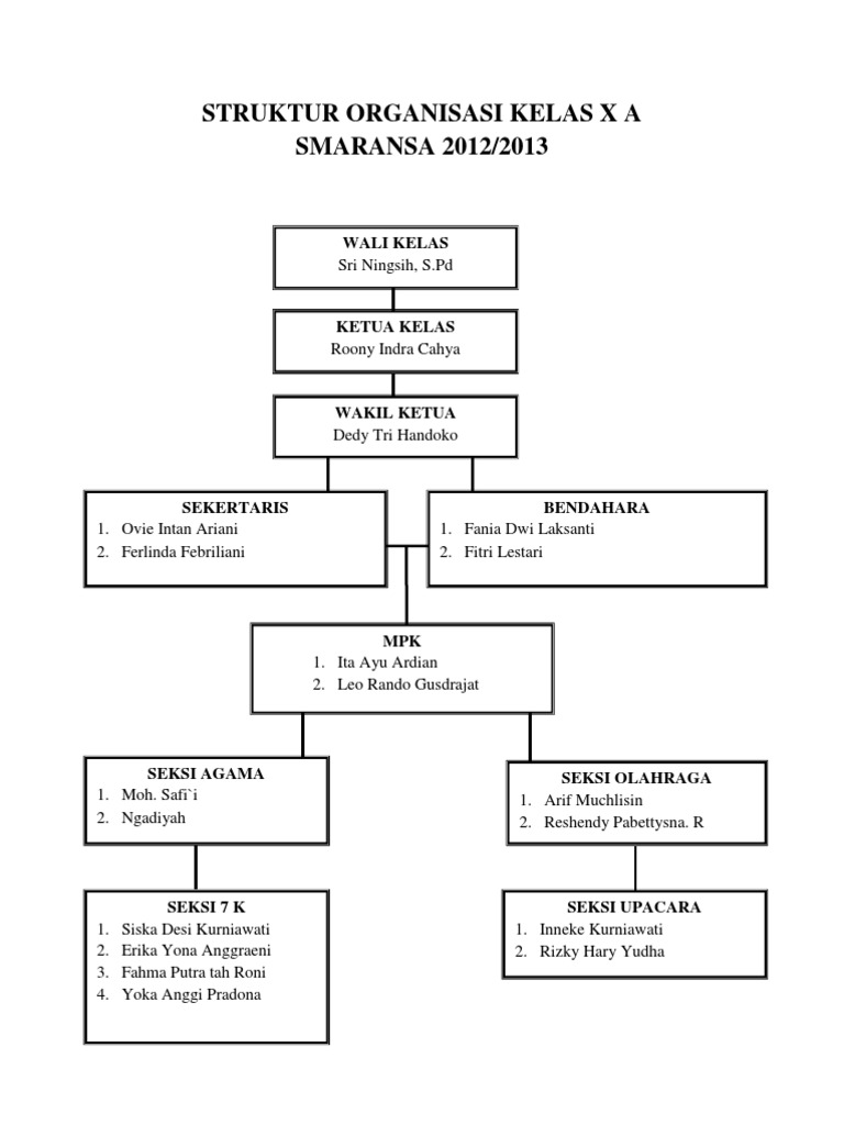 Contoh struktur organisasi kelas smk jurusan tataboga. Setiap organisasi seharusnya memiliki struktur yang jelas agar pembagian kerja, jabatan di dalam kelas pun kamu juga tentunya membutuhkan suatu struktur organisasi. Struktur organisasipengantar manajemen (thomas s bateman & scott a snell). Pasalnya disini wali kelas berperan sebagai pembina dalam sebuah organisasi kelas. Wali kelas pada umumnya juga dimasukkan ke dalam struktur organisasi kelas.